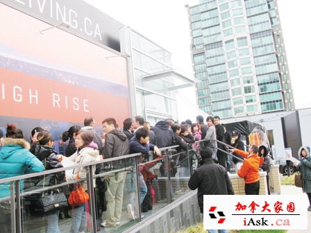 本那比鐵道鎮(zhèn)3月以來,由于好幾棟高層柏文樓花相繼推出,吸引了源源不斷的華裔買家,成為大溫柏文銷售的新熱點(diǎn)。 不久前才有數(shù)百中國買家冒零度低溫,漏夜排隊(duì)等待樓花開始銷售而引起混亂,昨日開始銷售的一個(gè)鐵道鎮(zhèn)新樓花,在地產(chǎn)經(jīng)紀(jì)的建議下改進(jìn)做法,更早接受有意愿買家打電話預(yù)約留位,但仍有已預(yù)約的買家擔(dān)心買不到心水單位,執(zhí)意在銷售中心開門前來排隊(duì),最長排有50多人。