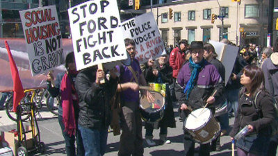 示威民眾分別來自勞工及小區(qū)團(tuán)體,他們認(rèn)為福特的政策削減了政府公共服務(wù)。他們也抗議福特?cái)M將多倫多廉租屋公司私營化的計(jì)劃。