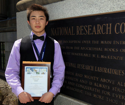 多倫多灣景中學(xué)的張同學(xué)(Marshall Zhang,音譯)參與新雞尾酒藥物療法發(fā)展工作,長遠(yuǎn)目標(biāo)是治療囊腫性纖維化癥,榮獲全國科研2011年生物天才挑戰(zhàn)獎。圖為張同學(xué)周二在渥太華領(lǐng)獎?!?加新社)