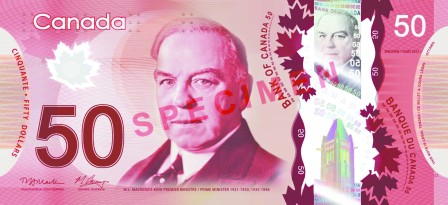 50元新紙幣的圖樣則顯示加國海岸保衛(wèi)船Amundsen號﹐反映加國于北極研究的領先地位﹔兩次任加國總理的William Lyon Mackenzie King也繼續(xù)保留于該紙幣正面。