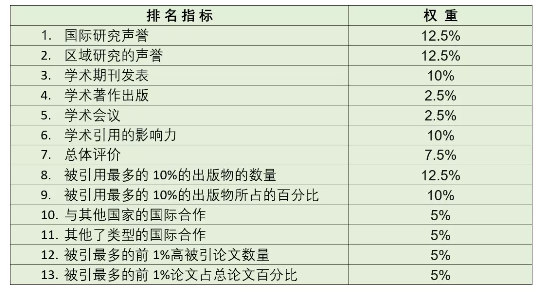 這項(xiàng)排名基于以下13項(xiàng)指標(biāo),衡量了各大學(xué)的學(xué)術(shù)研究表現(xiàn)以及它們的全球和地區(qū)的聲譽(yù),所以該排名可以作為廣大留學(xué)生選擇學(xué)校和專業(yè)的參考。