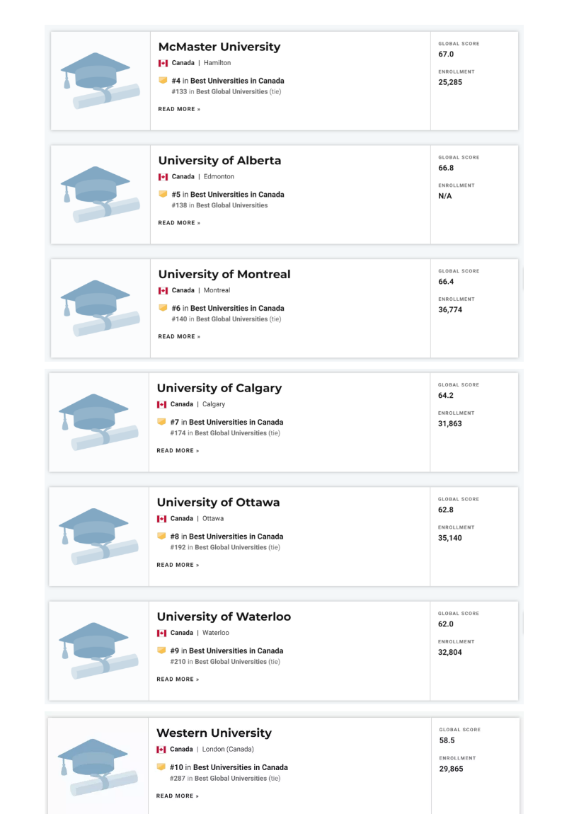 加拿大排名第4到第10位的大學(xué)依次為:麥克馬斯特大學(xué)、阿爾伯特大學(xué)、蒙特利爾大學(xué)、卡爾加里大學(xué)、渥太華大學(xué)、滑鐵盧大學(xué)、韋仕敦大學(xué)。
