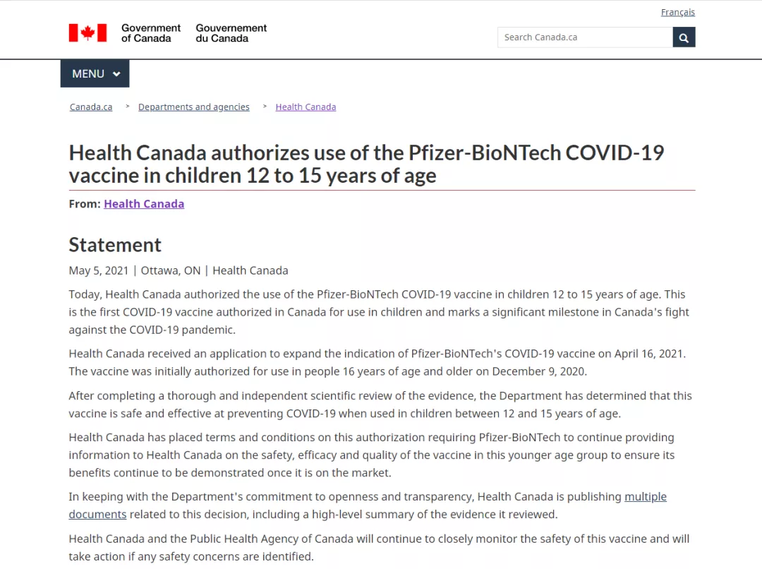 此外據(jù)加拿大聯(lián)邦衛(wèi)生部官網(wǎng)更新:加拿大聯(lián)邦衛(wèi)生部已批準(zhǔn)12至15歲的青少年接種輝瑞(Pfizer-BioNTech)的新冠疫苗,這意味著加拿大所有12歲及以上人士都可以接種這款疫苗。