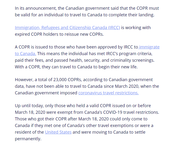 然而,由于疫情的影響,加拿大移民部發(fā)出去的有超過23000份COPR移民紙的持有者無法登陸加拿大。這個數字是加拿大政府統(tǒng)計的,由2020年3月份加拿大疫情進入大流行,限制所有國際旅行的邊境政策實施開始。