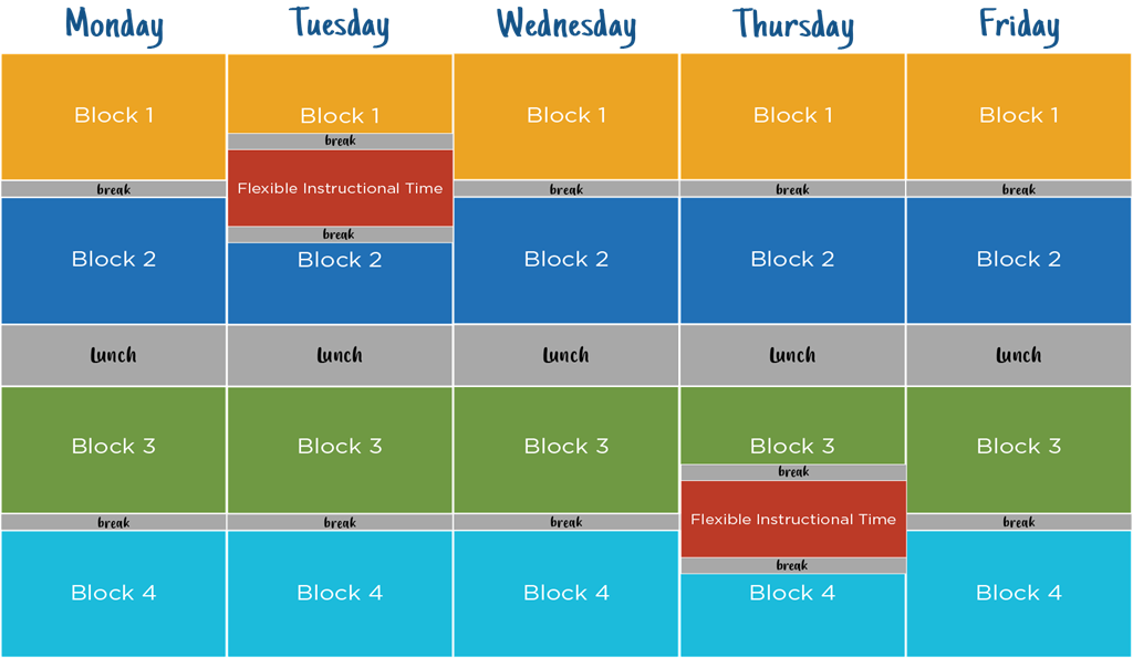 時(shí)間表包括每周兩段靈活的教學(xué)時(shí)間:周二50分鐘和周四50分鐘。這是旨在支持個(gè)性化學(xué)生學(xué)習(xí)選擇的教學(xué)時(shí)間。在此期間,所有學(xué)生和老師都在現(xiàn)場(chǎng)。學(xué)生可以參加每周課程、與同齡人合作、會(huì)見(jiàn)個(gè)別教師或從事可能超出預(yù)定課程范圍的學(xué)習(xí)活動(dòng)。將為學(xué)生提供教師和支持。