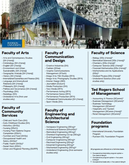 瑞爾森大學(xué)在加拿大大學(xué)中以其創(chuàng)新和職業(yè)力量成為領(lǐng)先的學(xué)校。瑞爾森大學(xué)設(shè)有75個(gè)專業(yè),主要集中在文學(xué)院、傳播和設(shè)計(jì)學(xué)院、社區(qū)服務(wù)學(xué)院、工學(xué)院和建筑科學(xué)、理學(xué)院、Ted Rogers管理學(xué)院,大部分專業(yè)都有機(jī)會(huì)提供帶薪實(shí)習(xí)的機(jī)會(huì)。