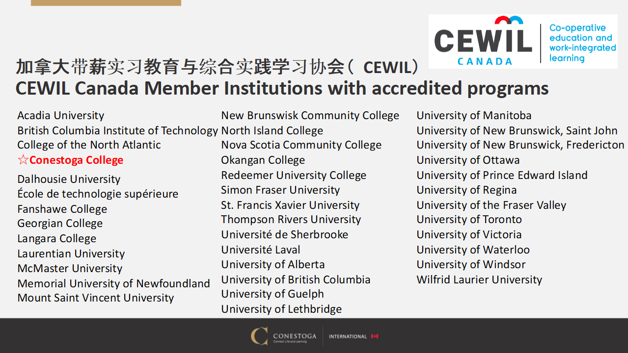康尼斯托加理工學(xué)院的co-op帶薪實(shí)習(xí)課程被加拿大帶薪實(shí)習(xí)教育與綜合實(shí)踐學(xué)習(xí)協(xié)會(huì)(CEWIL)官方認(rèn)可。目前,加拿大僅有40所院校提供認(rèn)可的帶薪實(shí)習(xí)課程,其中包括多倫多大學(xué)、滑鐵盧大學(xué)、麥克馬斯特大學(xué)、阿爾伯塔大學(xué)、英屬哥倫比亞大學(xué)、西蒙菲莎大學(xué)等。
