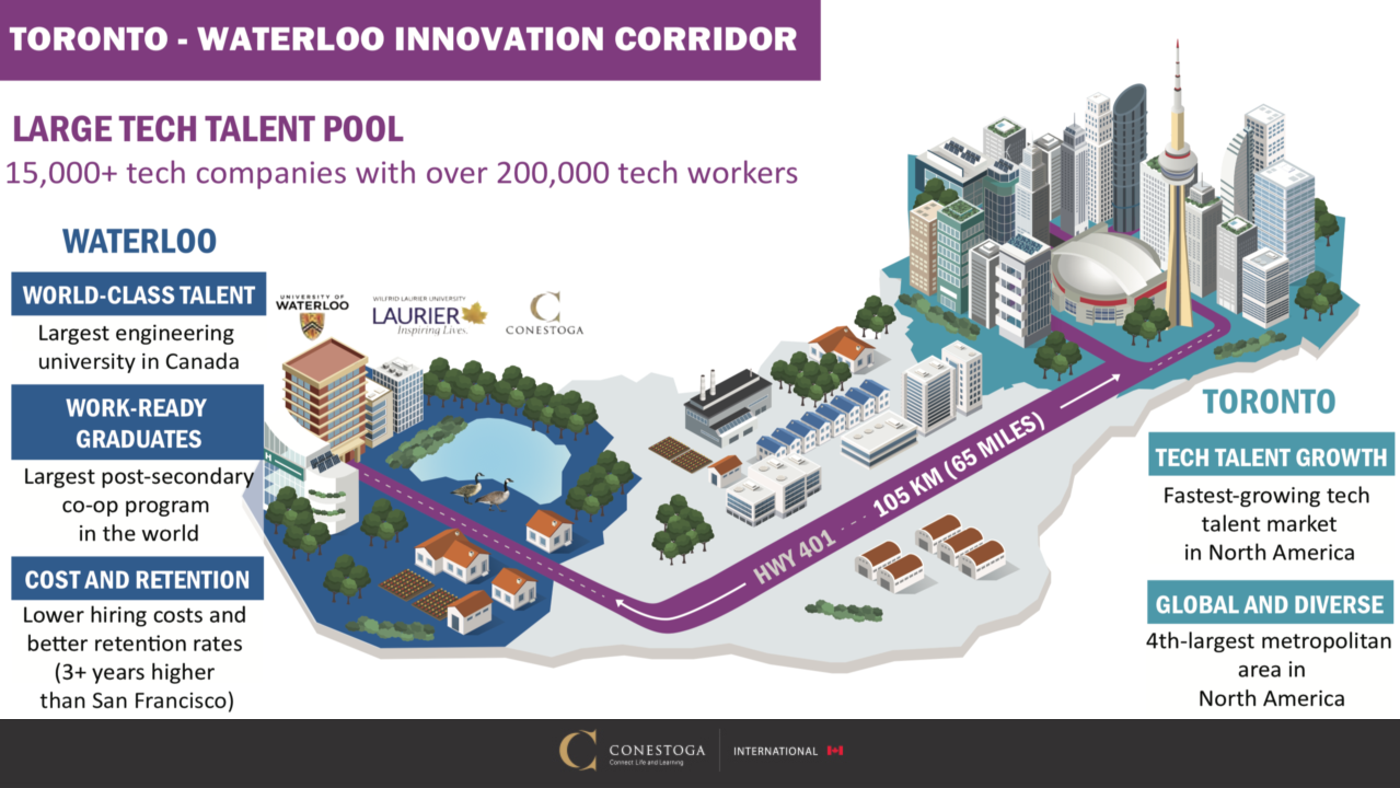 3. 得天獨(dú)厚的地理位置,地處多倫多-滑鐵盧高新科技走廊地段, 滑鐵盧地區(qū)被稱為”加拿大科技三角區(qū)”硅谷