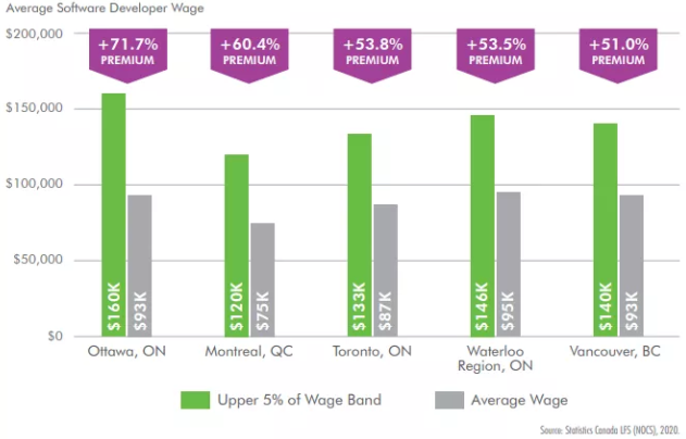 拿加拿大各大城市科技公司中的熱門崗位軟件工程師(Software Developer)為例,2020年的平均薪資水平均已經(jīng)接近10萬加幣/年。而在中位數(shù)薪資5%中,渥太華地區(qū)的軟件工程師年薪資甚至可以超過$16萬加幣。