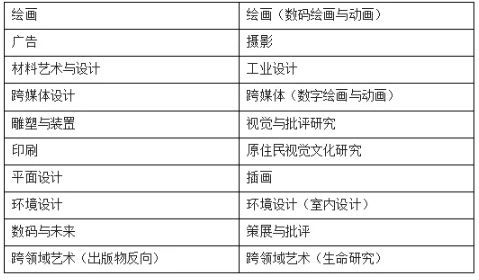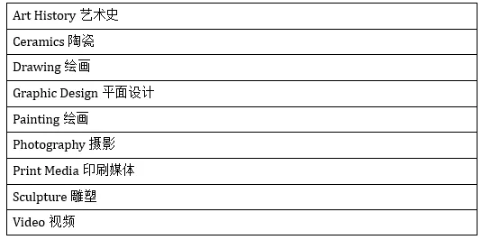 動(dòng)畫游戲設(shè)計(jì)、影視、攝影、設(shè)計(jì)(綜合)、交互設(shè)計(jì)、室內(nèi)設(shè)計(jì)、插畫、藝術(shù)史等。