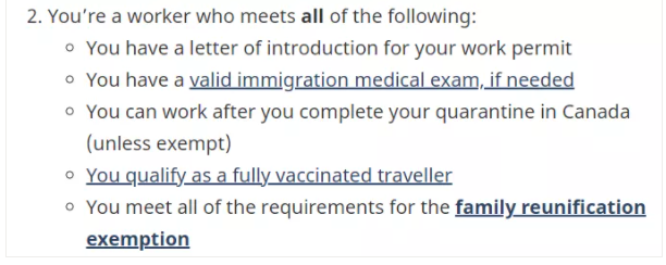 加拿大工簽(開放或封閉式)持有人的直系親屬即使沒有接種加拿大認可疫苗,也可以隨行或單獨入境加拿大。