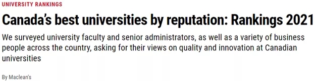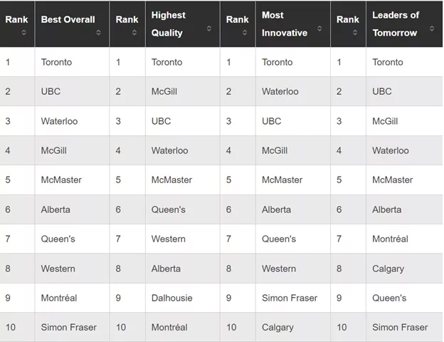 加拿大麥考林雜志調(diào)查了加拿大大學(xué)的的教職員工和高級(jí)管理人員以及全國(guó)各地的商界人士,向他們?cè)儐?wèn)對(duì)加拿大大學(xué)的質(zhì)量和創(chuàng)新的看法。將所有大學(xué)從本科、綜合和和醫(yī)學(xué)博士類(lèi)合并為一組,最后排名了49所加拿大大學(xué)。我們發(fā)現(xiàn),滑鐵盧大學(xué)的排名超越了麥吉爾大學(xué),擠進(jìn)了加拿大大學(xué)的“前三”。