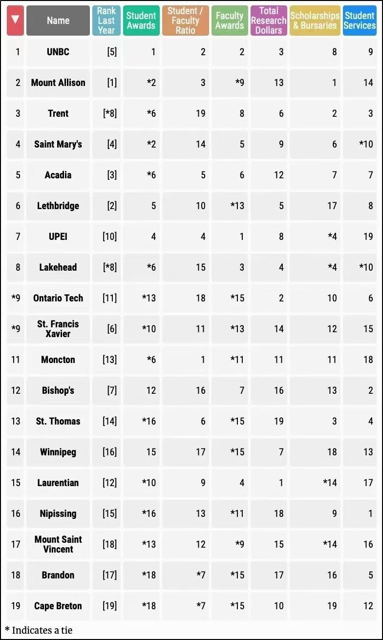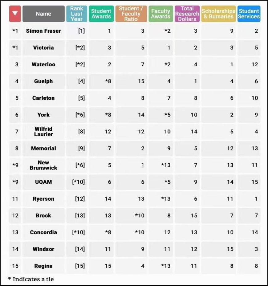 具體的評判方式,是會針對擁有全職學(xué)生1000人以上的大學(xué)進(jìn)行評分,某些宗教性質(zhì)的大學(xué)和針對性特別強的大學(xué)、新設(shè)立的大學(xué)以及非AUCC (Association of Universities and Colleges of Canada) 會員的大學(xué)均不在排名之列。
