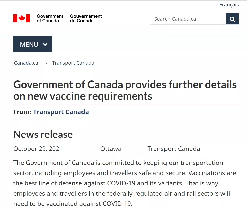 10月29日,加拿大政府公布了有關(guān)新的疫苗要求的更多細(xì)節(jié)。