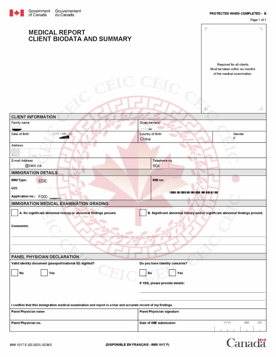 由移民局發(fā)出的體檢要求表(IMM 1017E)