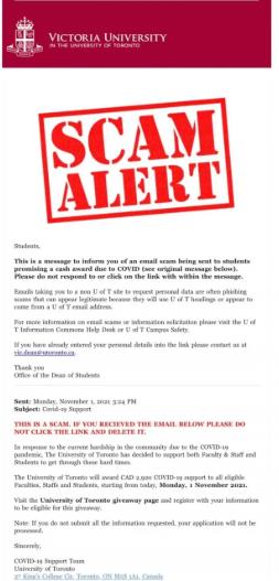 該通知警告說:“多倫多大學(xué)社區(qū)的許多成員收到了一封聲稱來自‘COVID-19支持團(tuán)隊(duì)’的電子郵件。”這封電子郵件要求收件人訪問‘多倫多大學(xué)贈(zèng)品頁(yè)面’以獲得現(xiàn)金補(bǔ)助。”