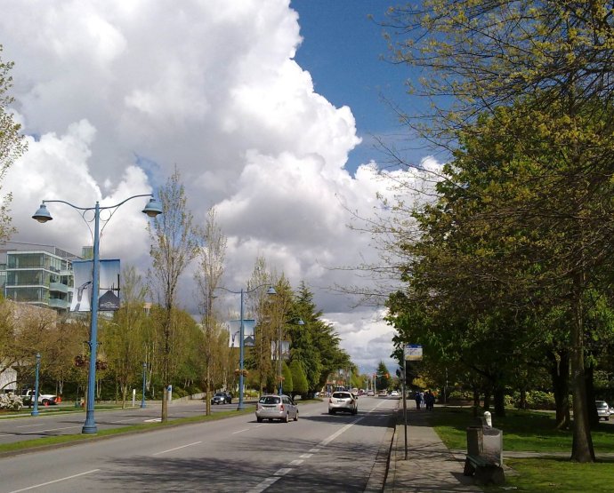 圖4:溫哥華的干線街道,路不寬,車(chē)也不多??纯刺焐系陌自?,在這樣的天氣里開(kāi)車(chē)一定感覺(jué)很爽。