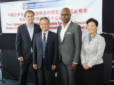 多倫多電影節(jié)主辦單位與中國駐多倫多總領(lǐng)館聯(lián)合推廣中國電影。左二起為陳立鋼、tiff共同主席貝里、張美芳。