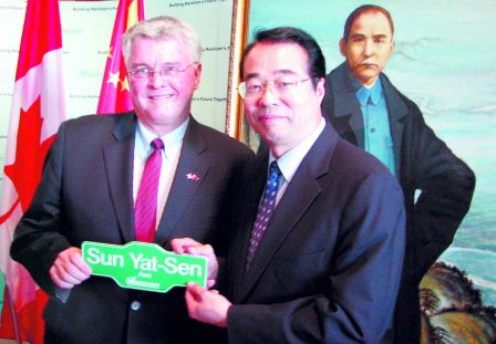中國(guó)國(guó)務(wù)院僑務(wù)辦公室副主任許又聲(右),與萬(wàn)錦市副市長(zhǎng)許正杰展示孫逸仙大道路牌。