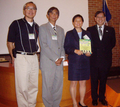 安省培正同學(xué)會前會長施永輝(左二)、展望青年領(lǐng)袖培訓(xùn)計劃代表李樹德(左一)、烈治文山市議員陳志輝(右一)和專題演講人李金艷(右二)合影