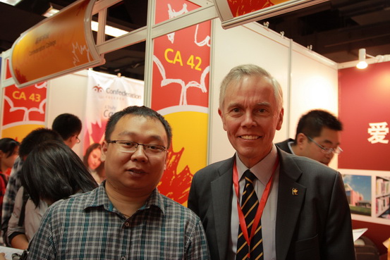 2011中國(guó)國(guó)際教育展現(xiàn)場(chǎng):學(xué)在加拿大首席專家David陪同加拿大駐中國(guó)大使馬大維(David Mulroney)與勞里埃大學(xué)代表面談