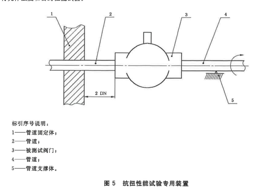 抗扭性能試驗(yàn)裝置如圖5所示,將被測試閥門3按圖5所示位置固定在裝置上,管道4應(yīng)支撐好使其不會(huì)產(chǎn)生彎曲力矩,按6.19規(guī)定的扭矩值平穩(wěn)地逐漸施加到管道上,保持10s。最后按規(guī)定進(jìn)行殼體強(qiáng)度和密封性能試驗(yàn)。